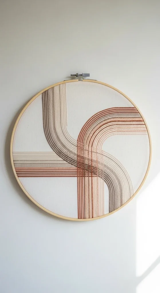 A neutral abstract line hoop is a great choice for modern homes because it feels handmade without looking overly crafty. The design can be very simple. Think curved arches, soft waves, uneven stripes, or a few layered shapes stitched in taupe, cream, terracotta, and dusty brown. These hoops are nice because they do not rely on perfect flower shapes or detailed lettering. They just need balanced spacing and a calm color palette. This makes them easier than they look. Use basic backstitch, long straight stitches, or small filled sections for texture. If you already have leftover thread from other projects, this is a smart way to use it up. You can also mix plain stitching with tiny fabric pieces for more interest while keeping costs down. This style looks especially good in living rooms, offices, and bedrooms with neutral decor. It is very easy to turn one hoop into a pair or trio for a gallery wall. The finished look feels current, simple, and easy to hang anywhere you want soft handmade texture.