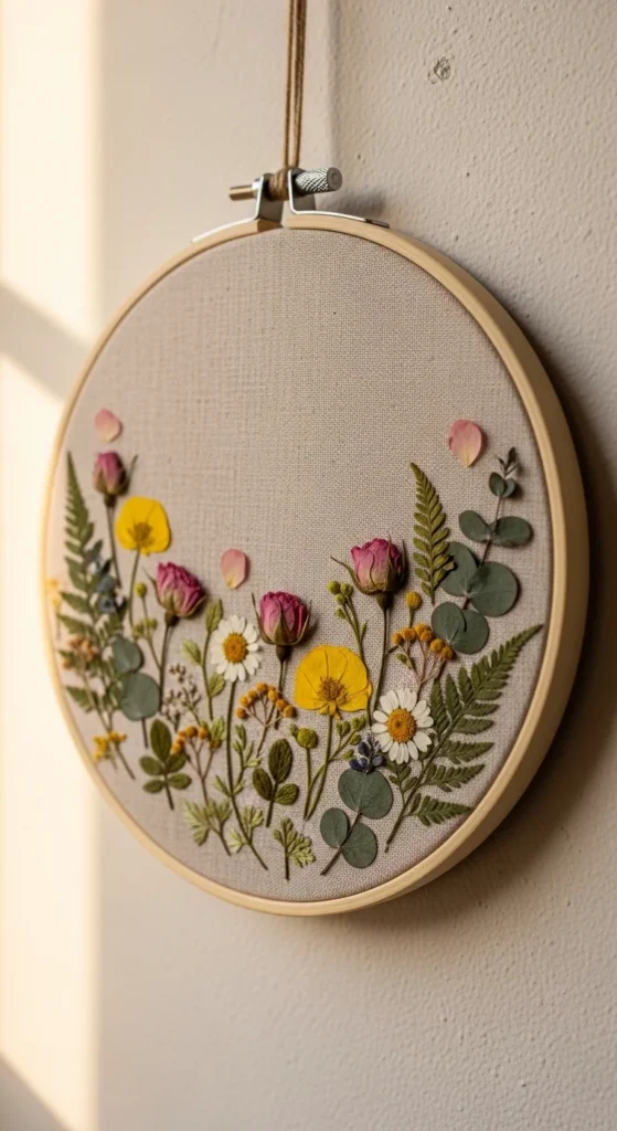 A pressed flower and stitch hoop mixes fabric art with natural texture in a way that feels soft and very Pinterest-friendly. Start with neutral fabric in linen or cotton, then stitch simple stems, vines, or leaf shapes as the base design. Once the stitching is done, attach tiny dried flowers or pressed petals in a few carefully chosen spots. This gives the piece a more layered look without a lot of extra embroidery work. It is important to keep the dried pieces light and minimal so the hoop still hangs neatly. This style looks especially nice in bedrooms, craft rooms, or cottage-inspired spaces. It is also a good idea if you enjoy mixed media projects and want to use flowers from a bouquet or your garden. To keep costs low, use small hoops and dried blooms you already have. Glue only a few pieces rather than covering the whole hoop. The charm of this style comes from restraint. A little real texture paired with simple stitches can make a hoop feel soft, personal, and beautifully handmade.