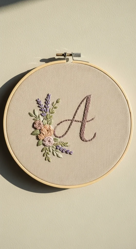 A monogram floral hoop makes wall decor feel personal while still keeping that soft handmade charm. Start with a single large letter stitched in the center using a simple script or block style. Then frame it with a few leaves, tiny flowers, or curved vines around the edges. This design works well because the letter gives the hoop structure, while the floral detail keeps it from feeling too plain. It is a lovely option for bedrooms, nursery walls, gifts, or gallery displays made for a family home. If you are trying to keep the project affordable, use one main thread color for the letter and two or three shades for the flowers. That is enough to make the design feel finished without buying too many floss colors. It also works nicely on thrifted fabric scraps if the material is not too thick. A monogram hoop can look classic, modern, or soft depending on your color choices. It is a strong choice when you want embroidery hoop art to feel meaningful, decorative, and easy to customize for your own space.