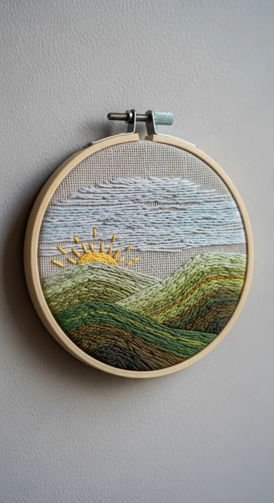 A tiny landscape hoop brings a calm scenic touch to your wall without taking up much space. Think soft hills, a tiny sun, a pale moon, or a few layered horizon lines in muted greens, sand, dusty blue, and warm beige. This style works beautifully because it turns simple shapes into something peaceful and personal. You do not need realistic detail. In fact, the best versions often stay very minimal. Use long stitches for hills, a small circle for the sun, and a few tiny knots or dots for texture. Small hoops are perfect for this project, which keeps the cost low and makes it easier to finish. You can create one hoop for a quiet accent or make a series of three landscapes in slightly different color palettes. They look lovely above a desk, bookshelf, or bed. This style is especially nice for people who love nature-inspired decor but want something more understated than florals. The finished hoop feels soft, handmade, and peaceful in a very simple way.