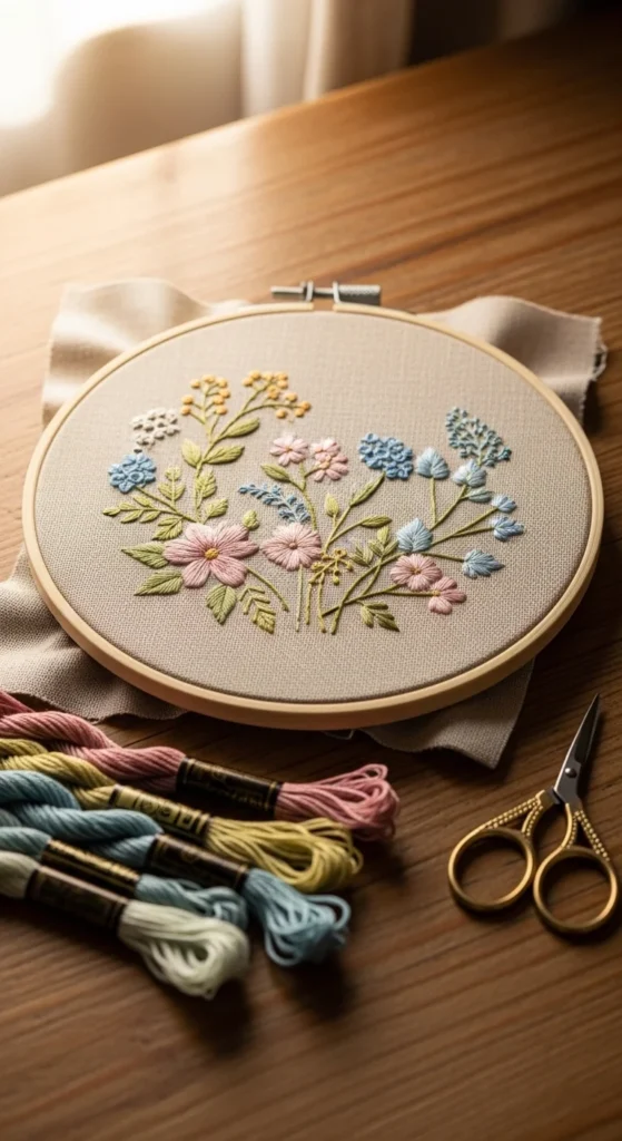 Floral hoop wall art is one of the easiest ways to start embroidery because it feels decorative right away and does not ask for a large piece of fabric. A simple flower pattern with leaves, stems, and a few buds can look lovely even with only two or three stitch types. You can use satin stitch for petals, backstitch for stems, and French knots for flower centers. That keeps the project beginner-friendly while still giving it texture. A small wooden hoop also acts as the frame, so there is no extra finishing work beyond trimming the fabric and securing the back. This is a smart choice if you want something handmade for a bedroom wall, gallery corner, or gift. Use scrap linen, old cotton pillowcases, or fabric from thrifted shirts to keep costs low. Soft pinks, creams, sage, and mustard look pretty together, though brighter shades work well for cheerful decor. A single hoop looks nice on its own, but a group of floral hoops can fill a wall beautifully. It is a practical first project because the result feels polished without asking for expensive materials or complicated planning.