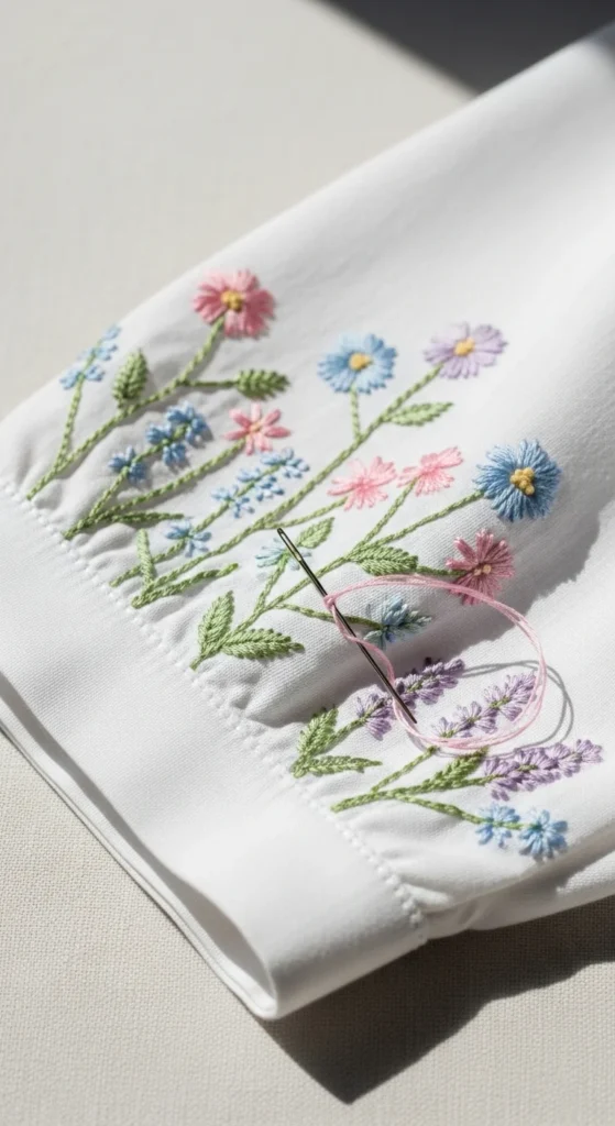 Blouse cuff embroidery is a lovely way to add subtle handmade detail to clothing without taking on a large fashion project. A few tiny stems, daisies, leaves, or dots stitched along the cuff edge can make a simple white or neutral blouse feel much more special. This style works well because the stitched area stays small, so it does not take weeks to finish. It also looks polished in a quiet way. Cotton blouses from thrift shops are a good base if you want to keep the cost down, and small flaws near the cuff can often be covered with the design. Use light thread shades for a soft look or darker thread for more contrast. If you are new to clothing embroidery, start with one cuff only and mirror it later if you like the result. A simple vine or repeated flower shape is easier than creating many different motifs. This project is a nice example of how embroidery can refresh clothing you already own. A plain blouse becomes more personal, and the handmade detail feels intentional rather than overly busy. It is a small project with a very wearable result.