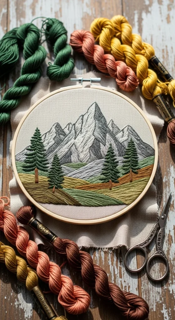 A mountain landscape hoop is a great choice if you prefer simple, scenic embroidery instead of florals. A few layered mountain lines, little pine trees, and a stitched sun or moon can create a peaceful design that looks modern and handmade at the same time. This kind of project works well with backstitch, split stitch, and a few filled areas, so it stays approachable even for newer stitchers. Neutral linen or oatmeal cotton makes a nice base because it gives the landscape a soft natural look. Browns, forest green, dusty blue, and cream thread fit this style especially well. If you want to save money, use only three or four floss colors and let the line work do most of the design. A small mountain hoop can look lovely in a hallway, office corner, or cabin-style room. It also makes a thoughtful gift for someone who loves hiking, camping, or outdoor scenes. Since the shapes are simple, you can sketch the design yourself without buying a pattern. It is a calm project that feels personal and a little rustic while staying easy enough to finish in a reasonable amount of time.