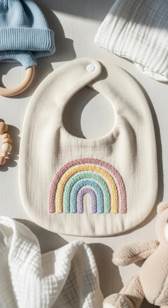 A baby bib with embroidered rainbow arches is a sweet handmade project that works well for baby gifts, keepsakes, or nursery sets. Simple rainbow shapes are beginner-friendly because they rely on clean curved lines rather than detailed filling. You can stitch one little rainbow in a corner or add a pair of tiny stars and clouds around it for extra charm. Bibs are small, so the design does not take too long, and plain cotton bibs are often easy to find at affordable prices. If you want to make the project even more budget-friendly, buy a simple multipack and embroider each bib differently. Soft muted colors like dusty pink, mustard, pale blue, and sage feel calm and modern, though brighter rainbow shades work too. This is a practical way to make a baby gift feel more personal without sewing baby clothes from scratch. If stitching on the finished bib feels awkward, you can embroider a fabric patch and attach it instead. It is a gentle, thoughtful project with a useful result, and the simple curved shapes make it especially approachable for beginner embroidery.