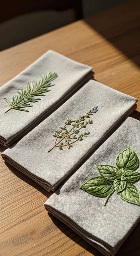 Herb sprig dinner napkins bring a simple handmade touch to the table and work beautifully for everyday meals or small gatherings. Instead of full floral patterns, stitch one neat herb sprig such as rosemary, thyme, basil, or lavender in the corner of each napkin. The narrow stems and tiny leaves keep the design clean and manageable. This is a good project for people who like minimal decor because the embroidery feels decorative without being loud. Plain cotton or linen napkins are easy to find, and secondhand cloth napkins can work just as well if they are in good shape. Use green thread in one or two shades, or add a soft purple accent for lavender. Since each napkin only carries one small motif, the set can be stitched over time rather than all at once. A group of matching herb napkins tied with ribbon also makes a thoughtful hostess or housewarming gift. This project feels polished, but the stitching remains simple enough for beginners with a little patience. It is a practical way to bring embroidery into daily life while keeping the design soft, neat, and affordable.