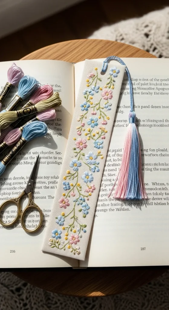 Stitched fabric bookmarks are small, useful, and very satisfying because they finish faster than most embroidery projects. A bookmark only needs a simple vertical design such as little flowers, stars, vines, mushrooms, or initials. Once the embroidery is done, back the fabric with felt or another piece of cotton and stitch the edges neatly. Add a tassel if you want a more polished look. This is a great project for scrap fabric because the pieces are narrow and small. It is also an easy handmade gift for readers, students, teachers, or journal lovers. Since the stitched area is limited, you can experiment with colors and tiny motifs without feeling overwhelmed. Use old linen, leftover cotton, or small felt pieces to keep the cost low. Floral stems and leaves are especially nice because they fit the long bookmark shape naturally. A set of two or three bookmarks tied together can feel like a very thoughtful present, even though the materials are simple. It is a practical embroidery idea that combines hand stitching with everyday use, and that makes it especially appealing for anyone who likes useful crafts.