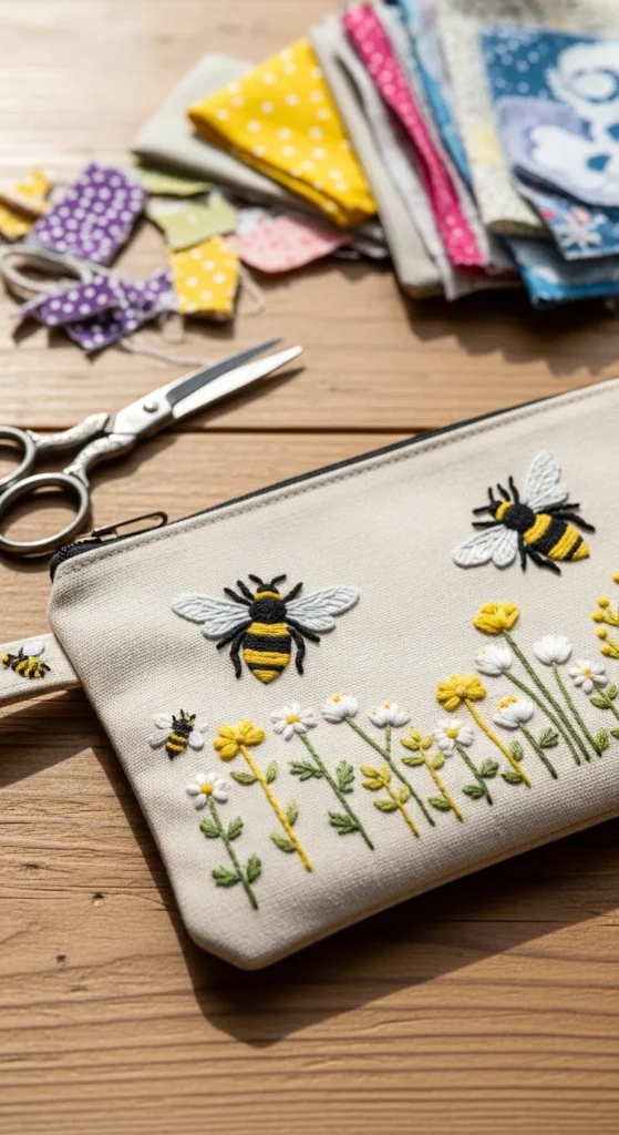 A bee motif zip pouch is a playful embroidery idea that adds charm to a useful everyday item. A small zipped pouch can hold makeup, pens, coins, earbuds, sewing tools, or little travel items, so the project feels practical from the start. Stitch one bumblebee with a few tiny flowers or dotted flight lines on the front corner of the pouch for a simple design that still stands out. Canvas and cotton pouches are often affordable to buy ready-made, which saves you from sewing the whole bag. If you want to keep costs even lower, use a thrifted pouch or make a fabric panel and attach it to something plain you already own. Yellow, black, cream, and green thread give the motif a cheerful look, and the bee shape is easy to simplify. A tiny oval body, stripes, and small wings are often enough. This is a good project for beginners who want to try embroidery on an object rather than a hoop. The result feels fun, giftable, and useful, which makes it a strong option when you want a project with everyday purpose.