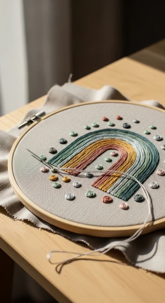Abstract modern hoop designs are perfect if you like a cleaner, less traditional embroidery style. Instead of flowers or names, you can stitch arches, dots, curved lines, blocks of color, and simple repeated shapes. This kind of design works especially well in neutral homes because the finished hoop feels like textile art rather than a themed craft piece. Beige, rust, sage, black, dusty pink, and mustard are popular choices, though you can use any palette that fits your room. This project is also budget-friendly because you do not need many stitch types. Straight stitch, satin stitch, and backstitch are often enough. Since the shapes are simple, you can sketch your own layout directly onto fabric without buying a pattern. This gives you a lot of freedom and helps the piece feel personal. Abstract hoops look nice on their own or grouped as a set on a wall. They are especially good for beginners who want something modern and forgiving, because the design does not rely on perfect flower petals or tiny details. It is an easy way to make handmade art that feels stylish and calm.