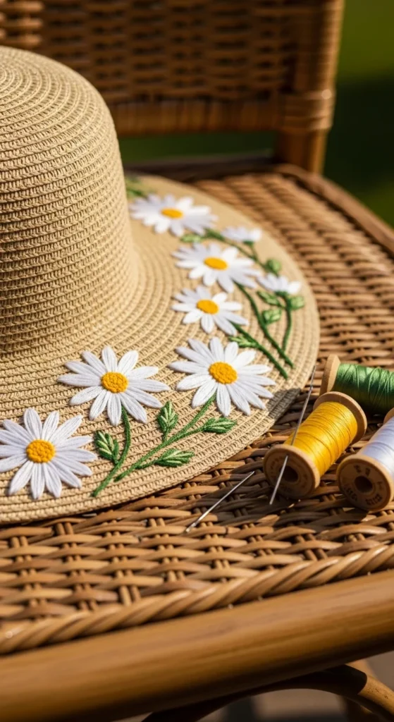 An embroidered sun hat brim is a lovely summer project that adds subtle handmade detail to a basic accessory. A few daisies, tiny leaves, or curved vine shapes stitched along one section of the brim can make a plain hat feel more charming without turning it into a huge project. This idea works best with fabric hats that are soft enough to stitch through. If the whole brim feels awkward, focus on a smaller section near the side or back. Neutral hats pair well with white, yellow, and green thread, while darker hats can handle brighter floral colors. Secondhand hats are a good choice if you want to keep the cost low and enjoy giving older accessories new life. This project is especially nice because you can wear the finished piece right away. Handmade clothing details often feel extra rewarding for that reason. If you want to stay simple, stitch only one repeated flower shape rather than several different motifs. A little embroidery goes a long way on accessories. It is a gentle, pretty way to make a summer hat feel more personal and memorable with just a small amount of stitching.