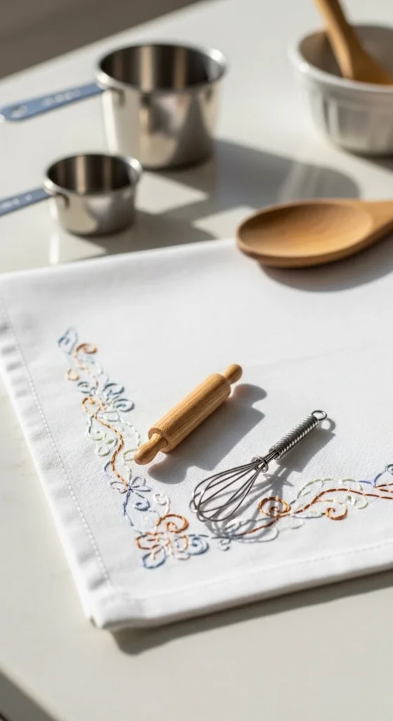 Baking-themed kitchen towels are a fun embroidery project for people who love homemade gifts and cozy kitchen decor. A plain white or beige towel becomes much more charming with a tiny whisk, rolling pin, cupcake, pie slice, or stitched loaf of bread in one corner. These little motifs are easy to simplify, so you do not need advanced embroidery skills to make them recognizable. This project works especially well for gift sets. Pair one embroidered towel with a wooden spoon, cookie mix, or loaf pan and you have a thoughtful handmade present. Cotton towels are easy to find at low prices, and thrifted linens can work too if they are clean and smooth. Choose one motif per towel to keep the design tidy and easier to finish. You can also stitch a short baking phrase as initials or a tiny family name if you want a more personal touch, though even one small icon looks lovely. Practical embroidery projects like this feel satisfying because they get used instead of stored away. It is a nice way to add handmade warmth to the kitchen without spending much money or taking on a huge project.