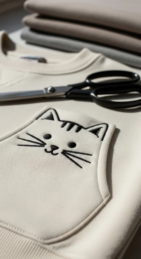 Animal pocket embroidery is playful, small-scale, and perfect for adding personality to plain sweatshirts, T-shirts, or pajama tops. A cat face peeking from a pocket, a tiny bear nose, bunny ears, or a sleeping fox can all work well in this format. Because the design sits on or near the pocket, you only need a small stitched area to make a strong effect. That makes this a nice project for beginners who want to personalize clothing without taking on a full shirt design. Use secondhand tops or basic plain pieces from discount stores to keep the cost low. Black thread on a cream pocket gives a cute minimal look, but soft browns, pinks, and oranges also work beautifully depending on the animal. The charm of this project comes from its simplicity. A few whiskers, eyes, and ears are often enough. It is a good choice for gifts too, especially for kids or animal lovers. You can make the clothing feel much more personal with very little embroidery. That balance of small effort and big charm makes it one of the most fun wearable embroidery ideas.