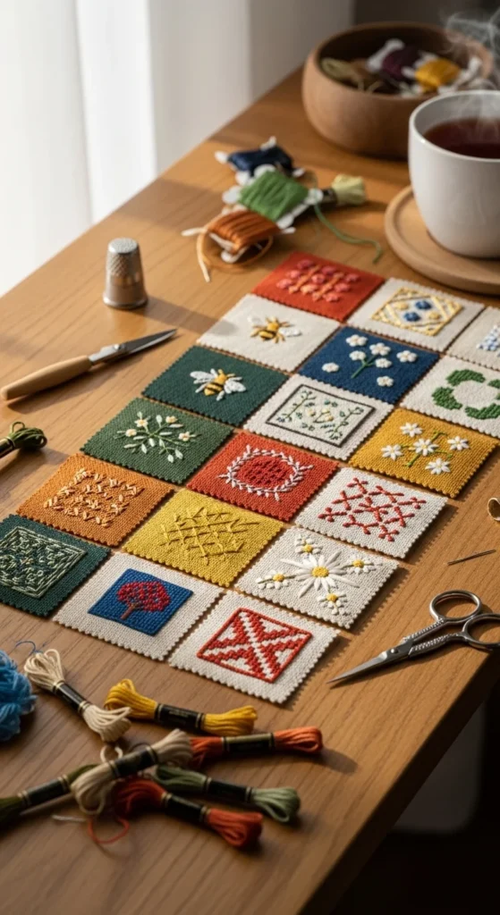 A sampler patchwork panel is one of the best embroidery ideas when you want to practice many looks without committing to one big design. Instead of stitching one large motif, divide a fabric piece into small sections and give each square or patch a different style. One patch can have flowers, another stars, another initials, another simple geometric lines. This lets you try colors, textures, and stitch types in a more relaxed way. It is also a very practical use for fabric scraps, since each section can be made from a different leftover piece. Once the embroidery is finished, the panel can become wall art, a pillow front, a tote bag insert, or a quilted piece later. This makes it feel like both a practice project and a real handmade item. If you are on a budget, this is a smart approach because you can use small thread leftovers too. The finished patchwork look feels cozy and very personal. It is especially good for beginners who want to build skill while still making something decorative. You get variety, flexibility, and a beautiful handmade result all in one project.