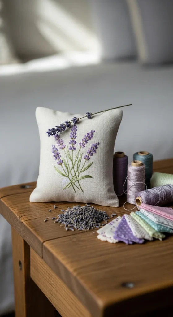 Lavender sachets are a charming embroidery project because they combine decoration with a practical use. A small stitched design on the front of the sachet can be as simple as a lavender sprig, a tiny flower, a heart, or a short row of little stars. Once the fabric is embroidered, sew or fold it into a small pouch and fill it with dried lavender. These sachets work well in drawers, closets, gift baskets, or on a nightstand. They are also a good way to use very small pieces of fabric, which helps keep the project affordable. Cotton scraps, linen leftovers, and even old shirt fabric can work nicely. If sewing the pouch feels like too much, you can stitch on one square and glue the edges around a ready-made fabric bag. Soft purple, cream, green, and beige threads fit the style well, though you can keep the design neutral if you prefer. This is a lovely project for batch making because each sachet is small and easy to personalize. A few handmade lavender sachets tied together can become a sweet gift that looks thoughtful and smells lovely.