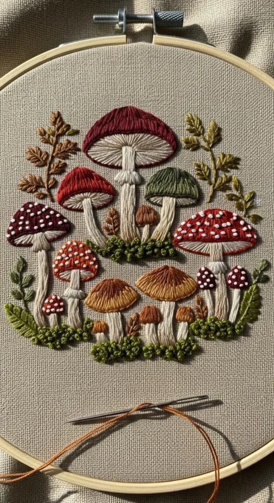 A woodland mushroom hoop is a great embroidery idea if you like earthy colors and small nature themes. Tiny mushrooms, mossy tufts, acorns, and simple ferns can create a cozy forest feel without needing a huge pattern. This kind of design works well with warm reds, rust, olive, brown, and cream thread shades. A few satin-stitched mushroom caps mixed with backstitched stems and little knot details can make the scene feel textured but still manageable. This project looks lovely in a kitchen, reading corner, or craft room, especially during cooler months, though the style works all year. Use natural-toned linen or thrifted cotton fabric to keep the background soft and rustic. If you want to save money, focus on a smaller hoop and a limited color palette instead of buying many floss shades. Nature-themed embroidery is nice because it feels detailed even when the individual shapes stay very simple. A mushroom hoop can also be paired with other woodland designs later if you want to build a matching wall set. It is a calm, cozy project that lets you play with texture and earthy color in a very approachable way.
