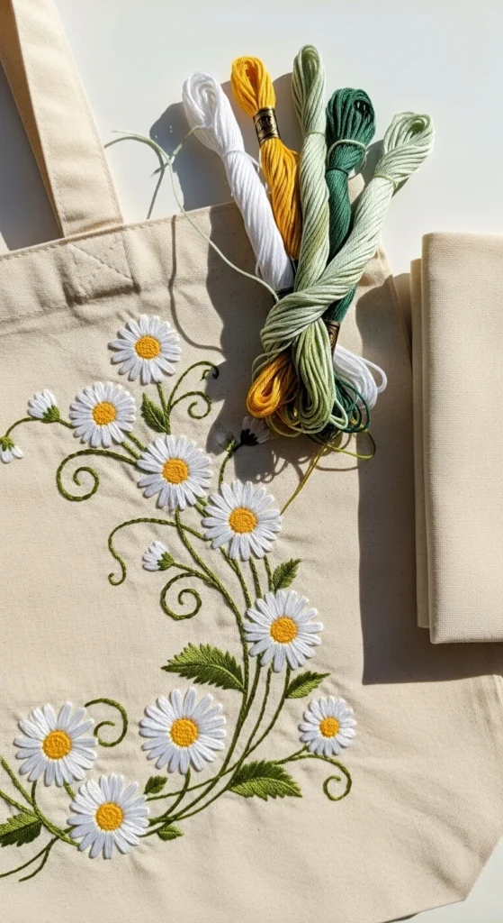 A floral corner tote bag is a practical embroidery project because you end up with something you can actually use every day. Instead of stitching across the whole bag, place a cluster of daisies, wildflowers, or leafy stems in one lower corner or near the pocket area. That keeps the design lighter and faster to finish while still adding charm. Plain cotton totes are often affordable, and secondhand canvas bags also work well for this kind of upgrade. If the fabric feels stiff, using a hoop around the stitched area helps a lot. This idea is perfect for gifts, market bags, library bags, or simple everyday carry. Choose a few easy flowers and repeat them rather than making every bloom different. That saves time and gives the design a tidy look. White and yellow daisies on a beige tote feel classic, but bright florals can look playful too. You can also stitch initials or a tiny bee near the flowers for extra personality. It is a smart way to turn a plain bag into something that feels handmade and personal without needing a large, time-heavy embroidery pattern.