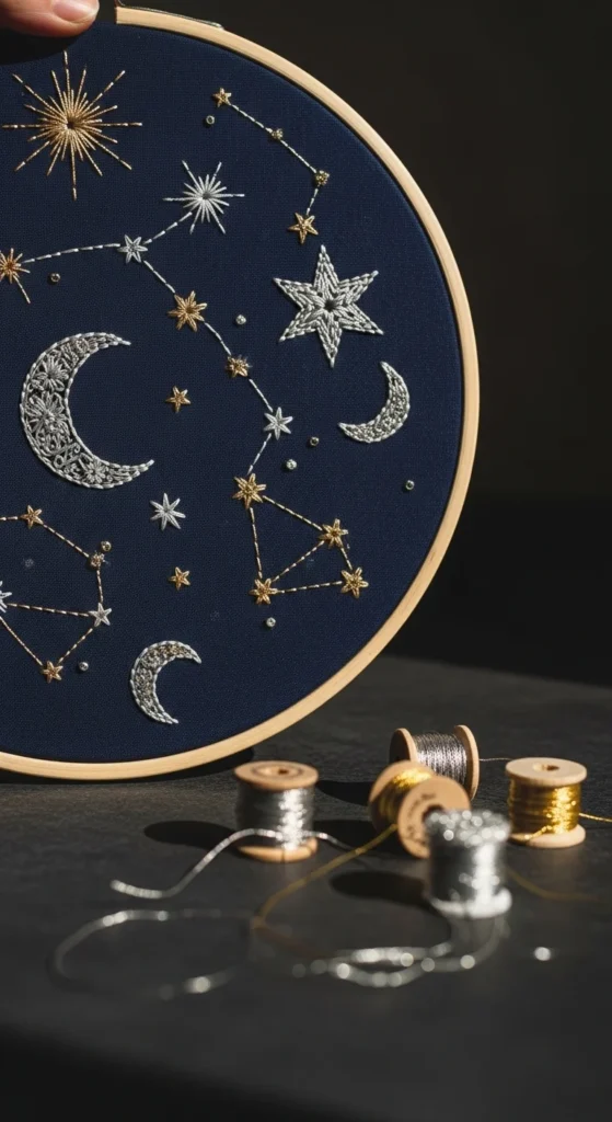 A celestial night sky hoop is a beautiful embroidery idea for anyone who likes moons, stars, and dreamy handmade decor. Dark navy or black fabric makes the thread stand out, so even simple stitches can look striking. You can stitch crescent moons, tiny stars, dots for constellations, and a few trailing lines with metallic-look floss or pale thread. French knots work nicely for stars, and backstitch is perfect for constellation lines. This project does not need a dense design to feel complete. Even a small cluster in one area of the hoop can look balanced and pretty. If metallic floss feels tricky, regular cream, gray, and mustard threads still create a lovely night-sky effect. This kind of hoop art looks nice in bedrooms, reading nooks, or as a handmade gift for someone who loves astrology or sky themes. Use scrap dark fabric from old clothing or pillow covers if you want to keep the project low-cost. A small hoop and only a few floss colors are enough. It is a calm project with lots of visual charm, and it gives you a piece of wall art that feels soft, magical, and handmade.