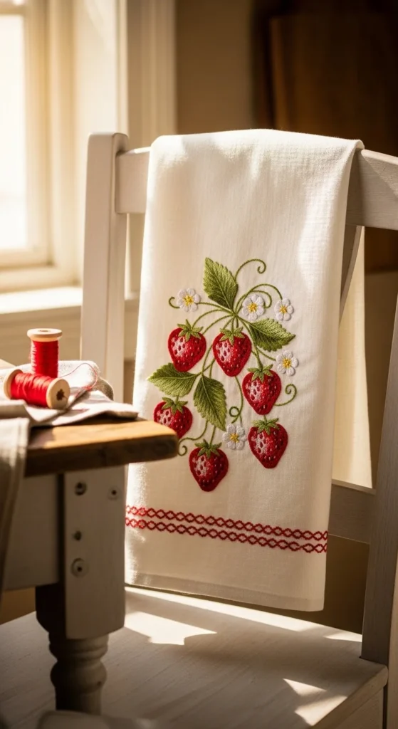 Fruit motif tea towels are cheerful, useful, and a nice way to bring handmade detail into the kitchen. Small strawberries, lemons, cherries, or oranges stitched along one edge or in the corners can make a plain towel look special without taking a huge amount of time. Tea towel embroidery is great because the fabric is usually simple to stitch through, and the finished piece is practical. It can be used daily, saved for guests, or gifted as part of a kitchen set. Cotton flour sack towels are often affordable, but plain thrifted linens can work just as well. Choose one fruit theme and repeat it for a neat design, or mix a few different fruits for a playful look. Red strawberries with green tops are especially beginner-friendly because the shapes are easy to recognize. If you want a fuller project, add tiny blossoms or leaves between the fruit. This is also a good handmade gift idea when paired with a mug, jam jar, or baking mix. It is simple, budget-friendly, and useful, which makes it one of the most appealing embroidery projects for everyday home decor.