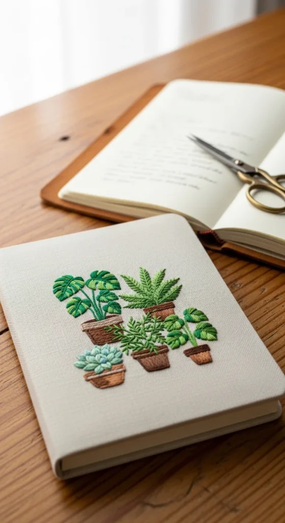 An embroidered notebook cover is a smart project if you want to combine craft with something practical for daily use. A row of little houseplants stitched onto a fabric cover can look playful and neat without needing advanced skills. Think tiny monstera leaves, cactus shapes, potted herbs, or simple trailing vines. You can stitch the design on a removable fabric sleeve or on a fabric scrap that gets glued or sewn onto a plain notebook. This keeps the project manageable and helps you avoid stitching through thick book covers. It is also a nice way to use leftover fabric pieces. Plant motifs work especially well because they are easy to simplify into basic shapes and lines. Green floss in a few shades usually goes a long way, so the project stays affordable. A handmade embroidered notebook can be used as a journal, recipe book, sketchbook, or planner, and it also makes a thoughtful gift. If you do not want a full plant row, one tiny potted cactus in the corner can still look cute. It is a practical project with a calm, homey feel that suits beginner stitchers and plant lovers alike.