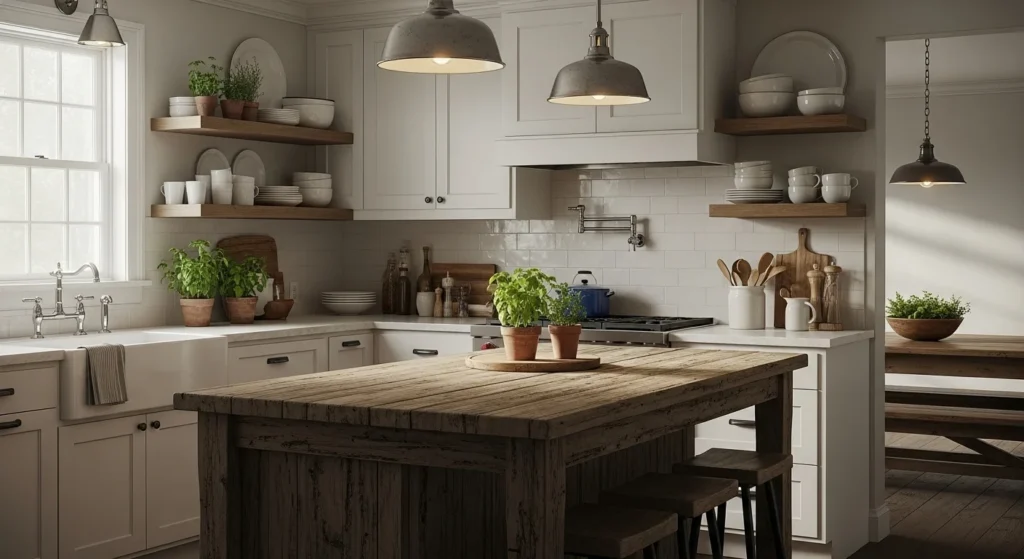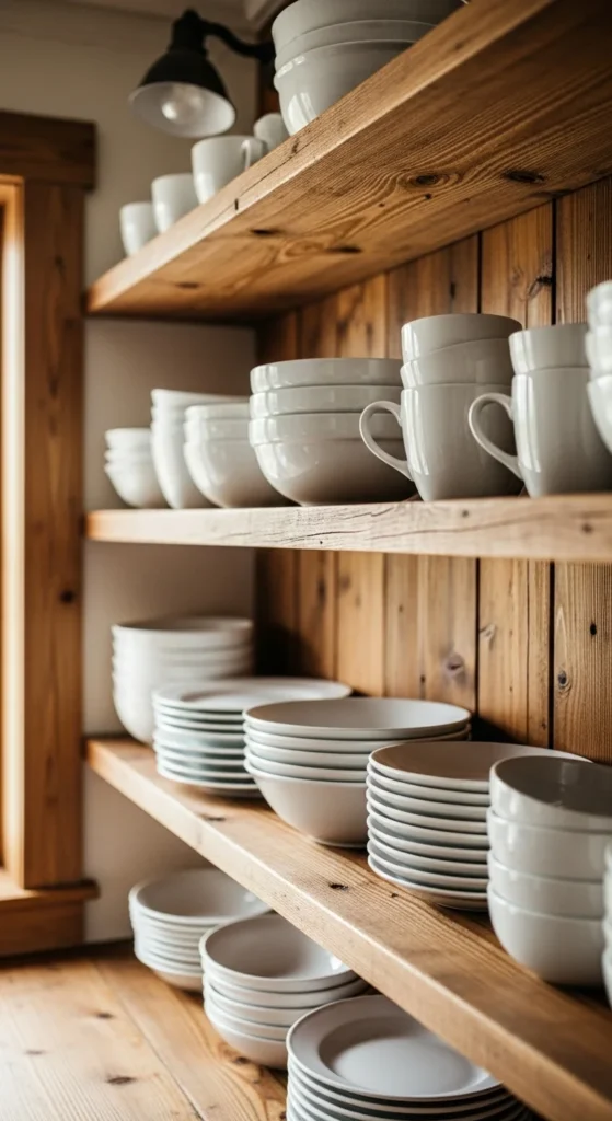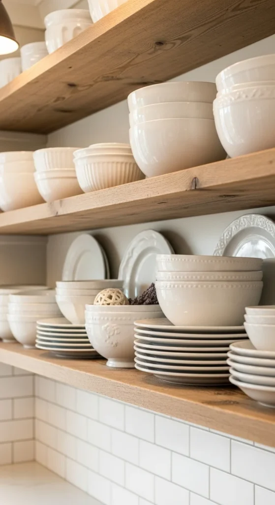 Ceramic dishes fit naturally into farmhouse kitchens. White or off-white pieces work best. Display items you actually use so the kitchen feels honest and practical. Avoid mixing too many styles. Keeping things simple helps the space feel calm.