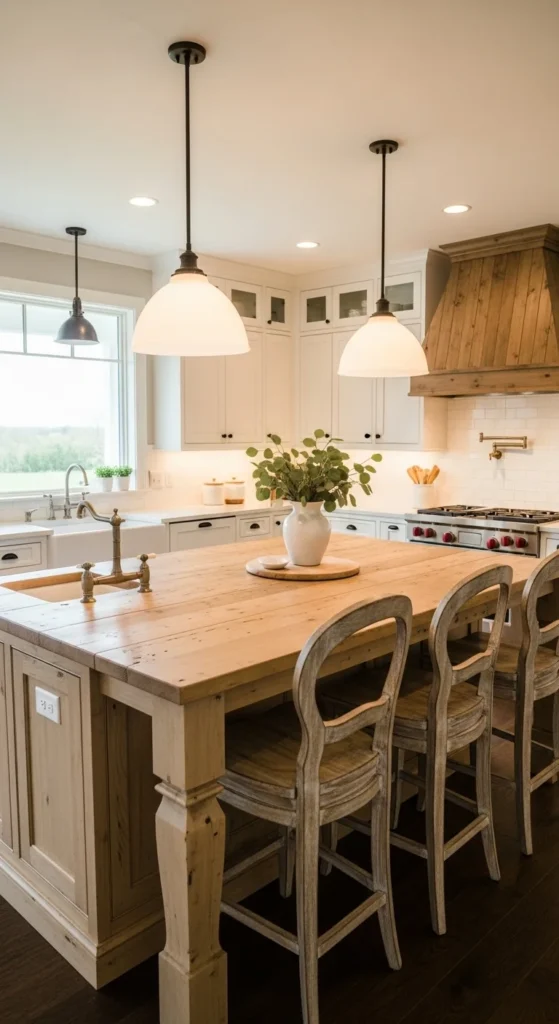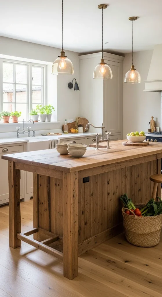 A wood island brings warmth into the kitchen and creates a strong farmhouse focal point. You can use a secondhand table, butcher block, or even a repurposed dresser. Imperfections add character, so scratches and knots are welcome. If space is tight, a narrow rolling island works just as well. Keep the surface mostly clear and use it for daily tasks. This single piece can anchor the entire kitchen and make it feel more grounded.