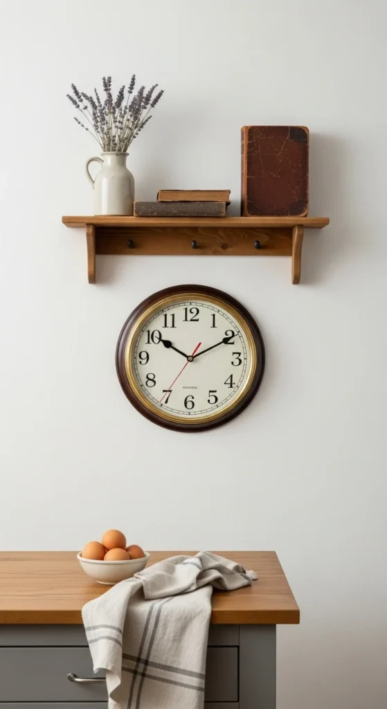 A vintage wall clock adds personality without taking up counter space. Choose one with a simple face and neutral tones so it blends naturally into the kitchen. Wood or metal frames work well. Place it on an open wall where it can be seen easily without dominating the space. This piece adds charm while remaining useful, which fits perfectly with farmhouse style.