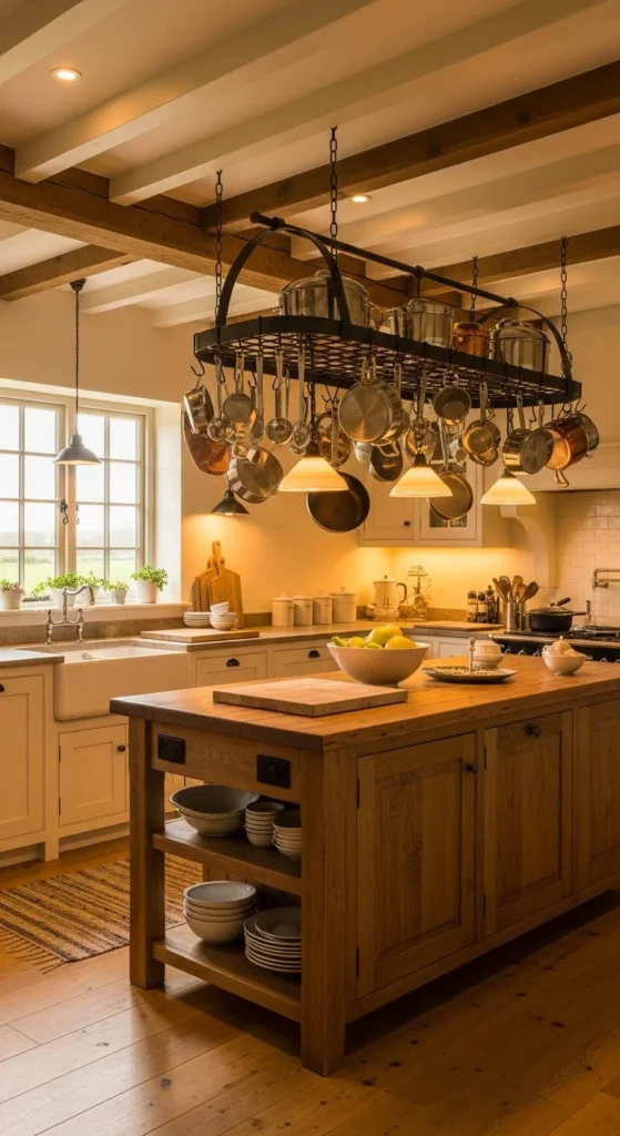 Hanging pot racks combine storage and decor in farmhouse kitchens. They free up cabinet space while keeping cookware within reach. You can install ceiling-mounted racks or wall-mounted rails depending on space. Even a small rack holding a few pots adds visual interest. Metal finishes like iron or brushed steel work best. This setup feels practical and lived-in while adding depth to the kitchen.