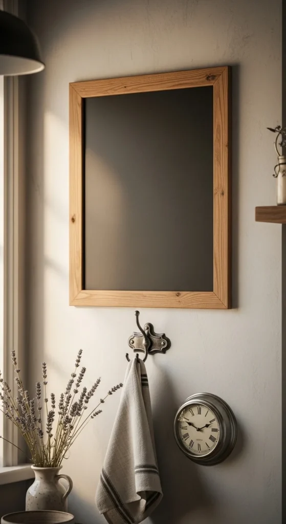 A chalkboard framed in wood adds farmhouse charm while staying functional. It can be used for grocery reminders or weekly menus. Keep the frame simple and rustic. Avoid oversized boards that overwhelm the wall. This piece adds warmth and a personal touch without cluttering surfaces.