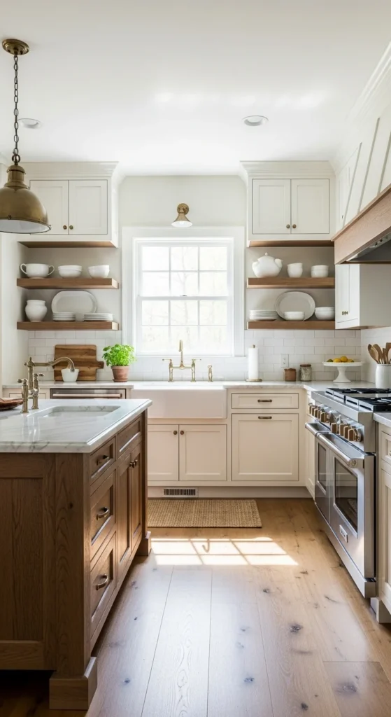 Open wooden shelves give a farmhouse kitchen a relaxed and welcoming feel because they show everyday items instead of hiding everything behind doors. You can use simple pine boards or reclaimed wood, even if the grain looks imperfect. Display dishes you already use, like plates, bowls, and mugs, rather than decorative items only. Stick to a small color range so the shelves do not feel busy. If drilling is not ideal, bracket shelves work well and are easier to install. This setup makes the kitchen feel personal and comfortable while keeping everything within reach.