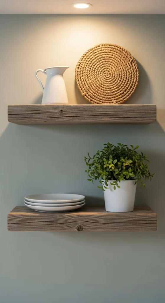 Floating shelves made from wood are easy to install and affordable. They work well for displaying everyday items or small decor pieces. Keep styling simple and balanced. Too many items can feel cluttered. These shelves add warmth while keeping the kitchen open and functional.