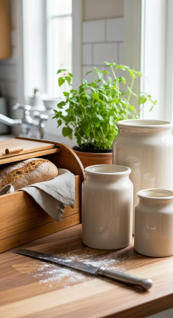 A wooden bread box adds warmth to the countertop while keeping everyday items organized. It replaces plastic bags or cluttered containers with something that feels intentional and simple. Bread boxes come in many affordable styles, and even a basic wooden box works well in farmhouse kitchens. Place it near other wood accents so it blends into the space naturally. This piece adds function without crowding the counter and works especially well in smaller kitchens where storage matters.