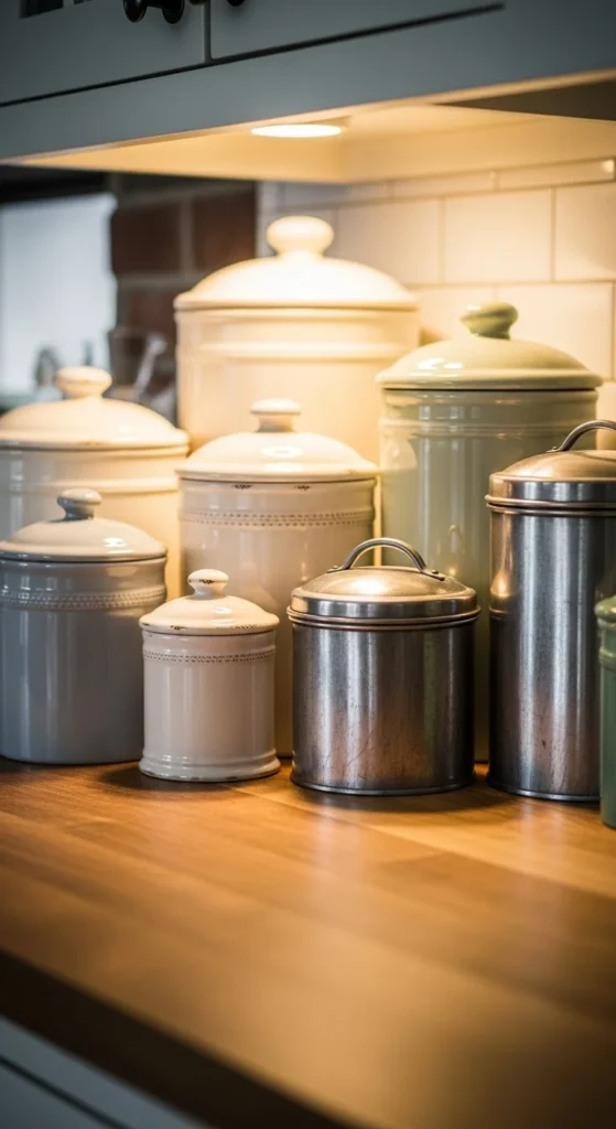 Vintage-style canisters help organize dry goods while adding charm to the countertop. Choose ceramic or metal options in neutral tones so they blend easily with the rest of the kitchen. You do not need a full matching set. Even two or three canisters create a balanced look. Place them near the stove or prep area for easy access. This keeps frequently used items close while maintaining a clean and simple appearance.