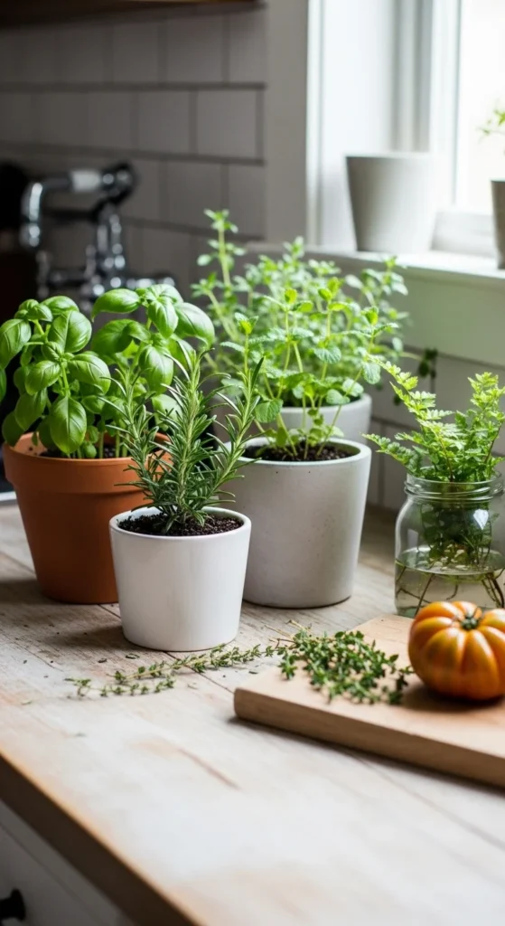 Greenery brings life into a farmhouse kitchen without effort. Small herb pots or simple plants work well on windowsills, shelves, or countertops. Use neutral containers made of ceramic, clay, or metal so the plants feel natural in the space. You do not need many plants. Even one or two add warmth and make the kitchen feel cared for. This is one of the easiest ways to add comfort without changing the layout or spending much.