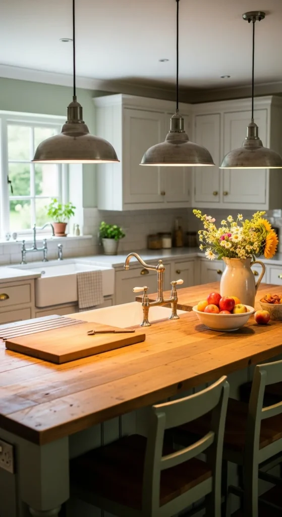 Lighting plays a big role in how warm a farmhouse kitchen feels. Simple metal or glass pendants with a worn finish work well above islands or sinks. You do not have to spend much since many budget stores carry farmhouse-style lighting. Use warm bulbs instead of bright white light. This creates a cozy glow that feels inviting during the evening and early mornings.