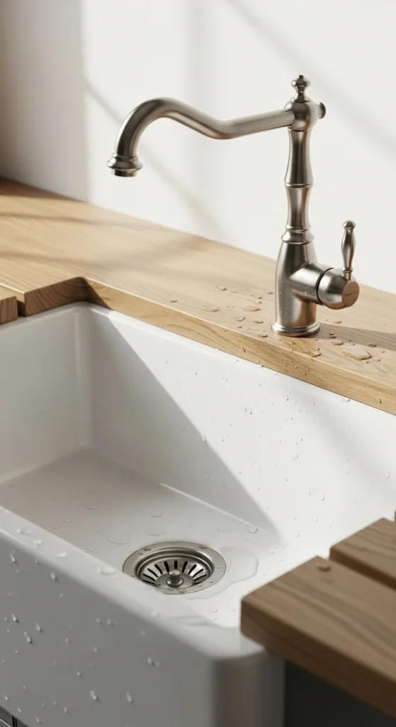 A farmhouse sink adds charm while staying practical for daily use. If installing a real apron-front sink is not possible, you can still capture the look with a deep white sink and traditional faucet. Keep the area simple with minimal accessories. This keeps the focus on function while adding visual warmth to the kitchen.