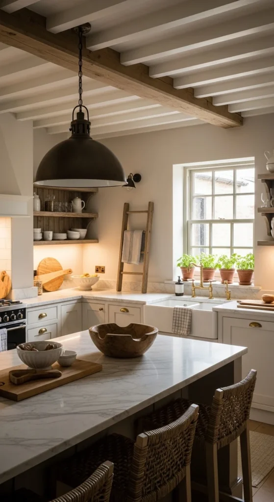 Wood beams bring instant farmhouse warmth because they add texture and depth above eye level. If your kitchen already has beams, letting them remain visible adds natural character. If not, faux beams are a realistic option that does not require major work. Lightweight wood beams can be installed over existing ceilings and painted or stained to match your decor. Natural wood tones work best for farmhouse spaces. Keep the rest of the ceiling simple so the beams stand out without overpowering the room. This detail makes the kitchen feel cozy and grounded while drawing attention upward, which helps the space feel balanced and intentional.