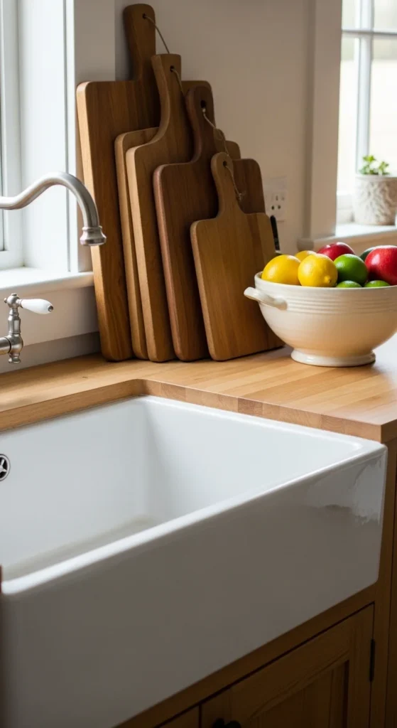 Wooden cutting boards double as decor when leaned against the backsplash. Use different sizes for variety. Thrift stores often have solid wood boards at low prices. This adds warmth without taking up counter space. It also keeps useful tools close by.