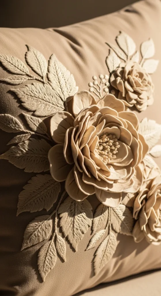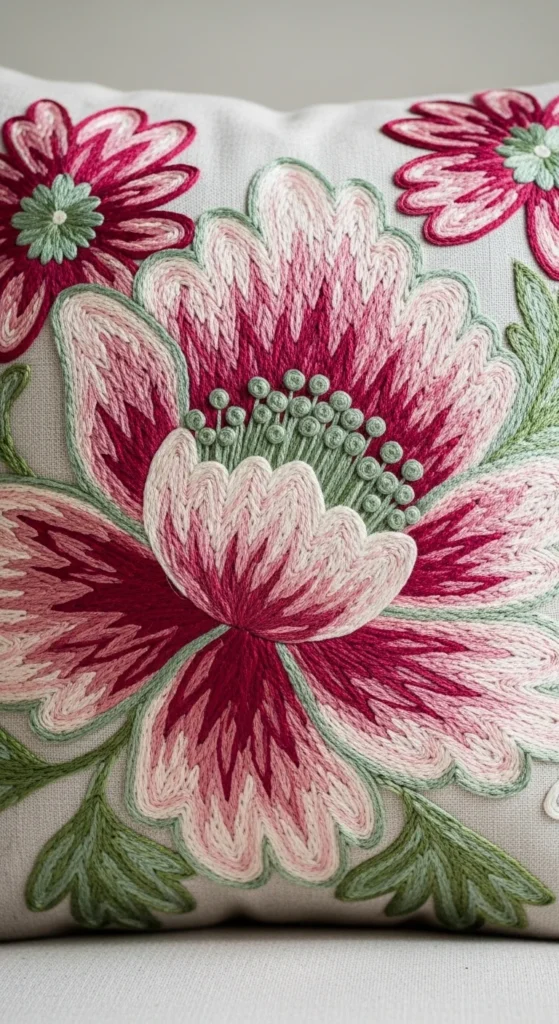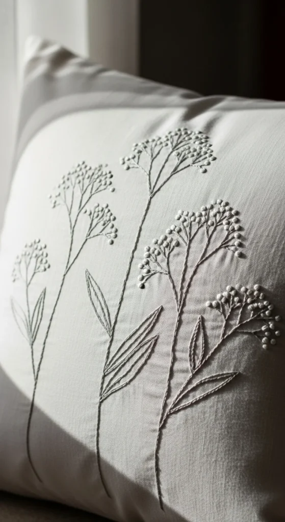 Raised floral embroidery can make a plain pillow feel much more special. Instead of keeping every petal flat, you can build one or two blossoms with slightly padded or layered stitching so they lift off the fabric. This gives the pillow a tactile look without needing to turn the whole surface into a heavy design. A good starting point is one central flower or one corner cluster rather than a full raised bouquet. That keeps the bulk under control and makes stitching easier. If you want to keep costs down, use regular embroidery floss and create lift with layered stitches instead of buying specialty materials. Raised petals look especially nice on velvet-look cushions, linen covers, or neutral cotton where the shape can stand out clearly. Pair the raised flower with flatter stitched leaves so the design stays balanced. This kind of embroidery is lovely for a reading chair pillow, guest room accent, or handmade gift cushion. It feels elegant because the texture is visible even from a distance. One plush posy can change the entire look of a simple pillow front.