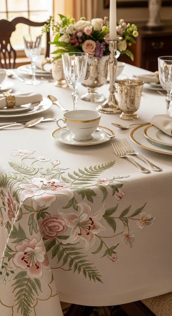 Metallic accents can make floral embroidery feel much more refined without turning the whole piece flashy. A tablecloth corner, runner border, or placemat set stitched with flowers in ordinary floss can be lifted beautifully by a touch of gold or champagne thread on stamens, outlines, or tiny leaf veins. This works best when the metallic thread stays minimal. A little shine goes a long way. If you are keeping the project budget-friendly, buy only one spool of metallic thread and mix it with thread shades you already have. This kind of embroidery is especially pretty for dining decor because candlelight or daylight catches the metallic details softly. Start with one corner motif before deciding whether the whole table linen needs repeating flowers. That way you do not overcommit. Soft florals with gilded centers can make even a plain runner feel festive and special. This is a very good pattern direction for holiday hosting, handmade dinner gifts, or a linen upgrade that feels graceful rather than busy. The floral base stays classic, and the metallic thread adds quiet richness.