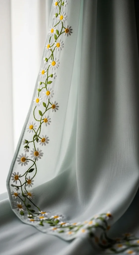 Floral border embroidery is a graceful way to decorate long fabric edges. A daisy chain pattern works especially well because the repeated flower shape creates rhythm without feeling too dense. This kind of border can inspire decor pieces too, not just garments. Think of pillow flanges, curtain edges, table runners, or fabric drapes displayed over furniture. Small repeated daisies with linked stems look fresh, soft, and very pretty when stitched along a clean edge. If you want a budget-friendly setup, choose one flower shape and two thread colors only, such as white and green or blush and sage. Repetition is what makes the design elegant, not a huge color range. A useful tip is to mark your spacing before you start so the chain stays even along the fabric. This style looks especially nice on light cotton, voile, and soft linen where the flowers can feel airy. Daisy chain borders give decor a festive but not overworked finish. They are ideal when you want embroidery that frames fabric gently and keeps the floral effect consistent from one end to the other.