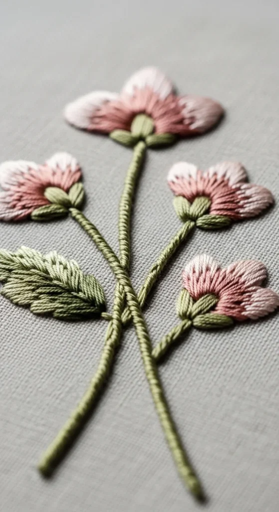 Satin stitch petals are a staple for floral embroidery because they create smooth, polished flower shapes that catch the light nicely. A simple satin-stitched bloom with one clean stem and two leaves can already look finished enough for decor. This makes silky stemwork a strong option for people who want classic embroidery that feels elegant but not overly complex. Start with a petal shape that is not too large so the satin stitching stays easier to control. A small tulip, daisy, or abstract blossom is a good first choice. If you are trying to save thread, keep the petals limited and let the fabric background do some of the visual work. Satin stitch looks especially good on hoops, napkin corners, and decorative pocket-style fabric panels because the smooth fill feels refined up close. A helpful tip is to keep your stitch direction consistent inside each petal so the finish stays neat. This type of floral embroidery may look traditional, but it continues to feel relevant because the result is clean, graceful, and beautifully suited to pretty handmade decor.