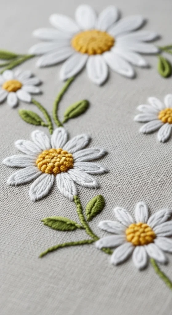 French knots are one of the easiest ways to add charm and texture to floral embroidery. In daisy patterns, knot centers can make the flowers look more tactile and lively without adding much complexity. This is why dotted daisy designs work so well for pretty decor. A few white or cream petals around a soft yellow knot center can instantly brighten a hoop, tea towel, or cushion corner. If you are a beginner, this is a very manageable floral style because the petals can stay simple while the knot center gives the design its depth. A good low-cost idea is to make a small cluster of daisies using only two or three thread colors. That keeps the project cohesive and uses very little floss. Daisies also combine beautifully with little leaves, tiny buds, and curved stems if you want to build out the design later. This pattern style feels cheerful and elegant at the same time, which makes it useful in kitchens, breakfast nooks, bedrooms, and gift projects. It is simple, textured, and one of the easiest floral ideas to make look polished.