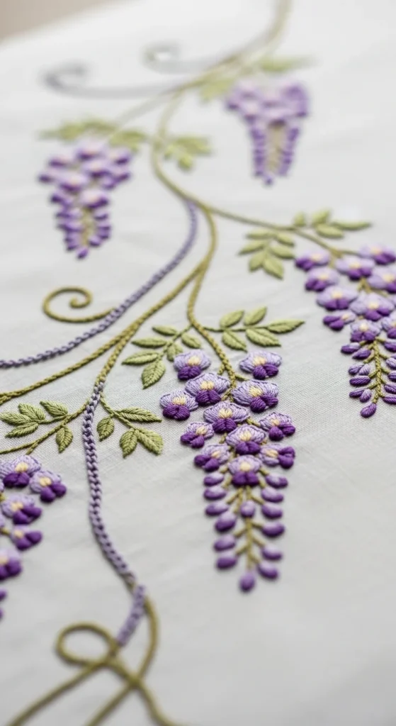Chain stitch vines are perfect for floral designs that need movement. A wisteria-inspired pattern uses flowing stems and hanging blossom clusters to create a very graceful decorative effect. This looks especially pretty on runners, curtain edges, long wall banners, and vertically framed hoops because the shape naturally wants to travel downward or across fabric. Start with one curved vine and let small blossoms hang from it in groups. Keep the color palette soft if you want the design to feel elegant. Lavender, dusty mauve, sage, and cream work beautifully here. If you are keeping the cost low, use a single blossom color and build the interest through spacing instead of many shades. Chain stitch is especially nice for stems because it gives the vine a little body without becoming thick. This kind of embroidery feels romantic and decorative without requiring extremely dense filling. It is a wonderful pattern choice for people who like trailing florals more than centered bouquets. Wandering wisteria can make even a plain piece of fabric feel gentle, flowing, and beautifully handmade.