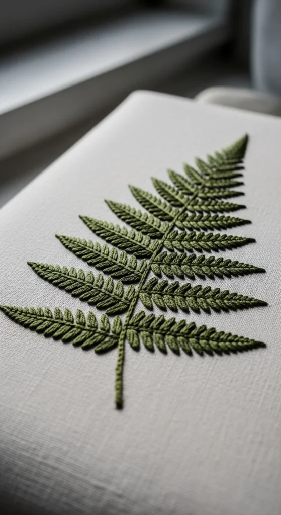 Detached raised leaf work can make botanical embroidery feel airy and sculptural. Fern fronds are especially beautiful for this because their slim leaflets already suggest movement and lightness. A floating fern pattern works well in hoops, framed botanical panels, and soft wall decor because the leaves seem to lift slightly away from the fabric. If you want to try this style without committing to a highly technical project, begin with one or two raised fronds mixed into a mostly flat botanical design. That gives the piece texture without making it too complicated. A budget-friendly approach is to reserve the raised work only for the focal leaves and keep the rest stitched in ordinary floss and simple outline techniques. Soft green, sage, eucalyptus, and muted olive shades work particularly well. This style feels very elegant because it is subtle. The beauty comes from the lifted edges and delicate movement rather than heavy color. Floating fern embroidery is perfect when you want floral decor that leans botanical, calm, and quietly detailed instead of lush and crowded.