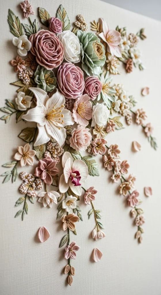 Placed floral motifs, inspired by couture embellishment layouts, can make wall decor feel instantly more sophisticated. Instead of one centered bouquet or full all-over pattern, place a few flowers strategically across the fabric so they look as if they are drifting or blooming naturally. One large bloom near the corner, two smaller flowers lower down, and a few leaves between them can feel much more elegant than a packed design. This is a wonderful style for wall hangings because negative space becomes part of the composition. It is also very budget-friendly since you do not need many motifs to get a strong result. Use larger petals for the main bloom and simpler shapes for the supporting flowers. If you want the piece to feel cohesive, repeat one leaf shape across all sections. Placed florals work well on rectangular fabric hangings, tall hoops, and decorative linen panels. This idea is especially appealing if you like floral embroidery but want it to feel refined and artful rather than sweet. Careful placement can make a modest amount of stitching look very polished.