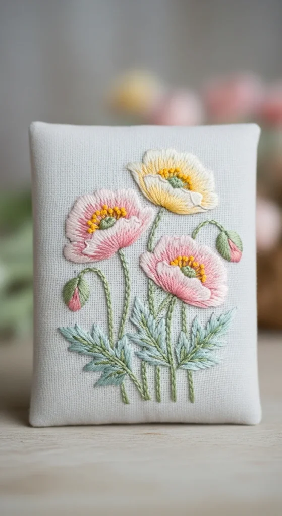 Pastel floral embroidery feels especially lovely in spring decor, and poppies are a strong choice because their shape is simple but expressive. A pastel poppy plaque can be stitched onto a small linen square, framed fabric board, or hanging hoop for a seasonal handmade accent. Soft peach, blush, butter yellow, faded coral, and powder blue all work beautifully in floral decor because they feel gentle without disappearing completely. If you want to keep the project affordable, choose one bloom shape and let color changes create variety rather than designing multiple kinds of flowers. Poppy petals can be stitched fairly simply, which makes this pattern beginner-friendly too. Add one or two stems and a couple of leaves, then let the background stay open. The result feels light and decorative rather than busy. Small plaques like this are ideal for shelf styling, spring mantel displays, or bedroom wall groupings. They also make sweet handmade gifts because the floral pattern feels cheerful and elegant without needing a very large or time-consuming composition.