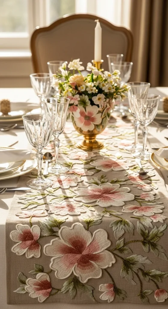 Some embroidered decor feels special because it invites touch as much as admiration. A floral runner with softly raised petals, knot clusters, and layered leaves can add this kind of tactile richness to a dining table, dresser, or entry surface. The idea is not to make every flower bulky. Instead, choose a few petals, centers, or leaves to give extra texture so the whole design feels more alive. This works beautifully on runners because the long format lets small textured clusters repeat along the length. If you want to keep the cost down, build tactile detail with ordinary stitches like French knots, layered satin sections, and slightly padded leaves rather than using specialty materials everywhere. Soft floral textures look especially elegant in neutral palettes such as cream, sage, pale blush, and warm taupe. A runner like this feels decorative but still practical because the embroidery can be placed mainly near the ends or edges. It is a lovely option if you want floral decor that feels handmade in a more sensory, intimate way and adds gentle richness to a room without shouting for attention.