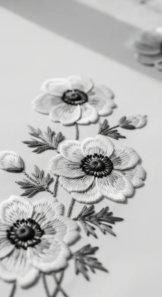 Monochromatic floral embroidery can look incredibly elegant because the detail comes from texture and shadow rather than color contrast. An all-white or ivory floral design on matching or slightly off-white fabric feels especially refined in bedrooms, formal dining decor, and soft minimalist interiors. Anemone-style blooms work beautifully here because their petal shape gives the stitching enough definition even when the thread color stays tonal. Use satin stitch, French knots, and a few outline details to let the flower show through the fabric in layers. If you want to keep it affordable, this is a great style because one thread family can cover the whole project. You do not need a large collection of floss. Monochrome embroidery looks best when the fabric has a little texture, such as linen or cotton slub, because the surface helps the tonal work stand out. This kind of floral pattern is perfect for pillow shams, guest towels, hoop art, and decorative panels. It feels soft, clean, and quietly luxurious. If you prefer decor that whispers rather than shouts, an all-white floral embroidery piece is a beautiful choice.