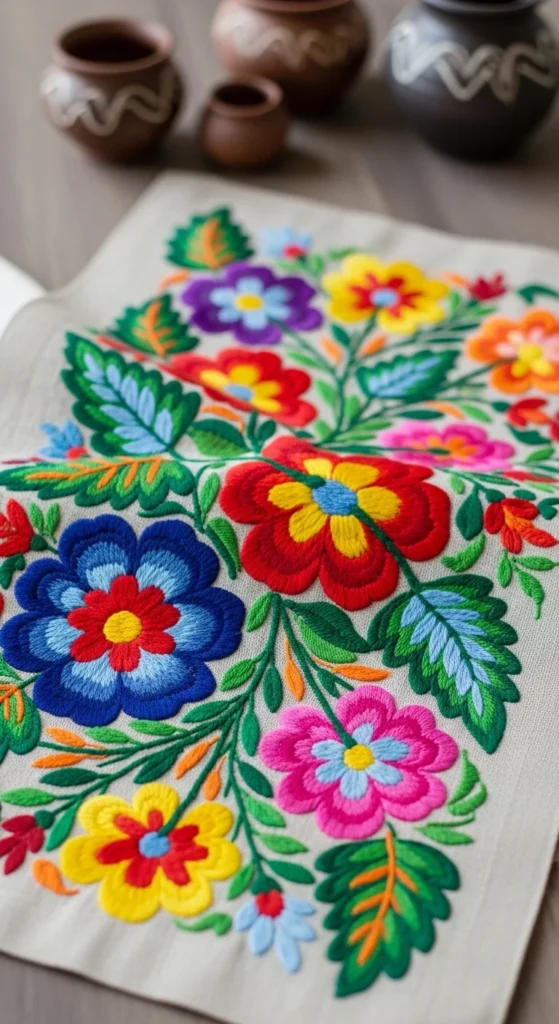 Bright folk-inspired floral embroidery brings energy to decor in a way softer florals do not. Bold petals, strong outlines, and decorative leaf shapes can create a joyful pattern that still feels elegant when the layout is controlled. A floral fan motif or repeated folk bloom cluster is especially pretty on wall hoops, table mats, and cushion fronts. The key is to let the colors be lively while keeping the composition clear. Try one repeated floral shape with a strong center and balanced leaves rather than many competing motifs. If you are working on a budget, this style is perfect for using leftover bright floss from older projects. Mixed pinks, oranges, blues, greens, and yellows can all work together here. Folk-style florals often look better when they feel handmade and slightly imperfect, so you do not have to chase a highly polished finish. This makes them especially fun for personal decor. A well-placed bright floral fan can completely change the mood of a neutral room. It adds warmth, color, and a handcrafted feel without relying on mass-produced patterns.