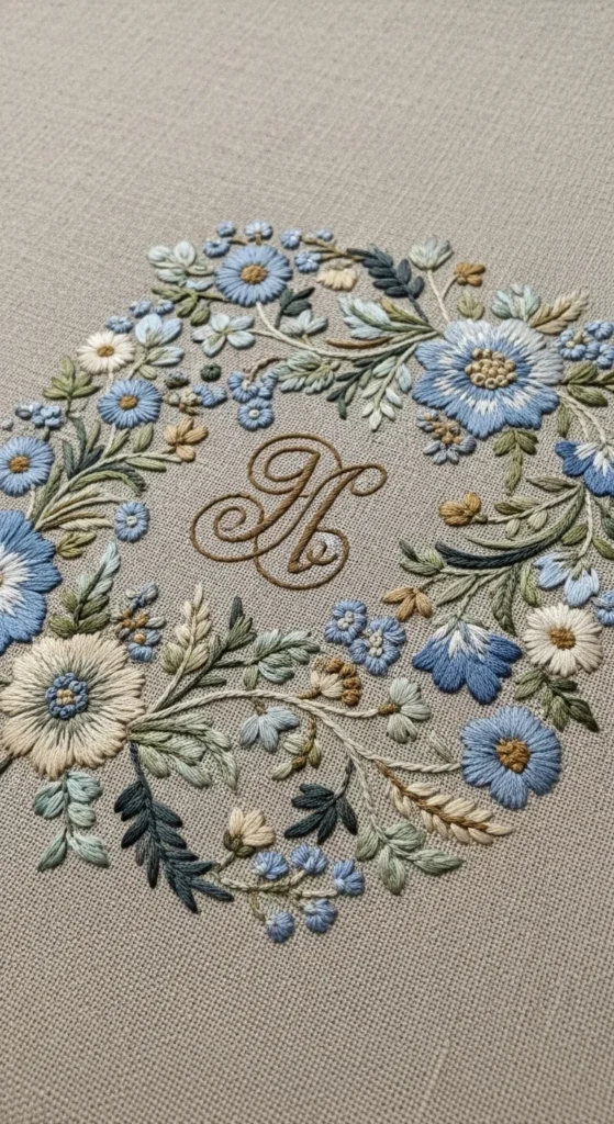 Personalized floral embroidery becomes even more special when the monogram is tucked quietly into the design. Instead of placing a large obvious initial beside the flowers, stitch the letter into a stem curl, leaf vein, or petal edge so it feels like part of the composition. This makes the decor piece feel personal without losing its elegance. A small wall hoop, pillow corner, hand towel, or fabric gift wrap can all carry this kind of hidden detail beautifully. If you are on a budget, this is an excellent project because you only need one floral cluster and one letter worked into it. The final design looks thoughtful and custom without requiring a large amount of stitching. A useful tip is to sketch the monogram into the stem path before you start so the shape feels natural rather than forced. This pattern idea is perfect for wedding gifts, housewarming decor, nursery keepsakes, or personal room accents. It adds meaning while keeping the overall look soft and floral. Secret stem initials are subtle, pretty, and wonderfully giftable.