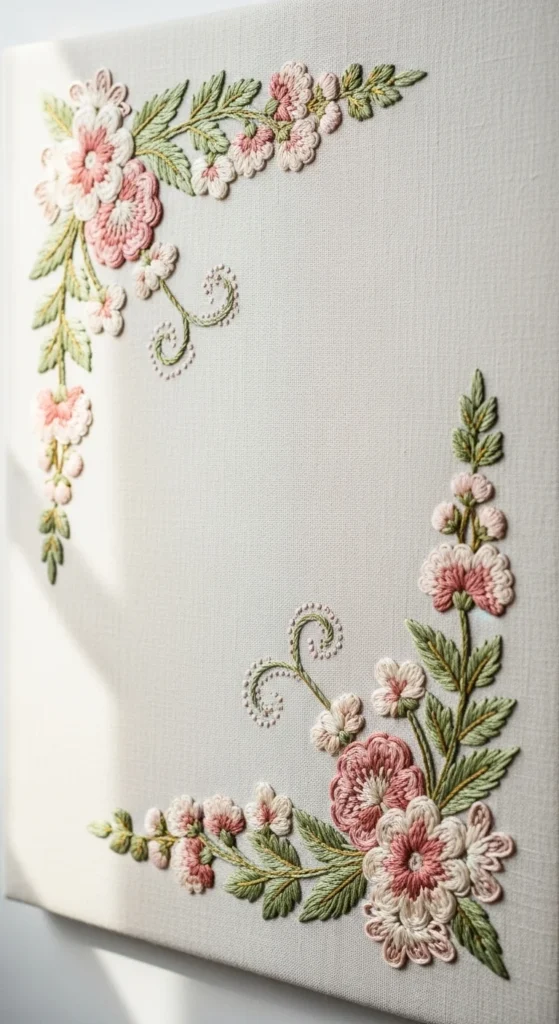 Corner floral embroidery is one of the easiest ways to make handmade decor feel tidy and elegant. Instead of centering the flowers, let them grow inward from one or two corners of the fabric. This creates a framed effect that works beautifully for wall panels, table linens, hand towels, and cushion fronts. The open center keeps the piece light, while the floral corners give enough decoration to feel finished. Start with one main bloom in the corner and let smaller leaves and buds trail gently inward. This is also a budget-friendly style because you only need to stitch part of the surface. The empty space does a lot of the design work for you. Corner florals can be soft and romantic, minimal and modern, or lush and layered depending on the thread colors and stitch choices. A useful tip is to keep the two corners visually related if you are stitching more than one. Repeat at least one flower or leaf shape so the piece feels cohesive. Framed garden corners are graceful, practical, and very easy to adapt for many kinds of handmade home decor.